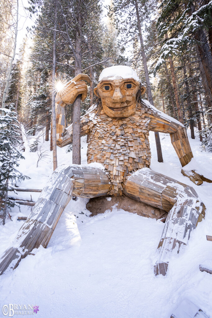 On my way to Crested Butte I finally had a chance to visit Isak Heartston in Breckenridge. After a short stroll through the forest I saw this giant character smiling at me through the trees. It made me feel like a kid. Isak rises to about 50 ft. tall when he awakens at night and roams the forest. Serendipitously, I arrived just when the sun was diffracting through the branches to form a beautiful sun-star in the frame.